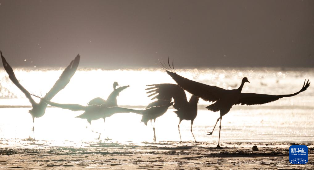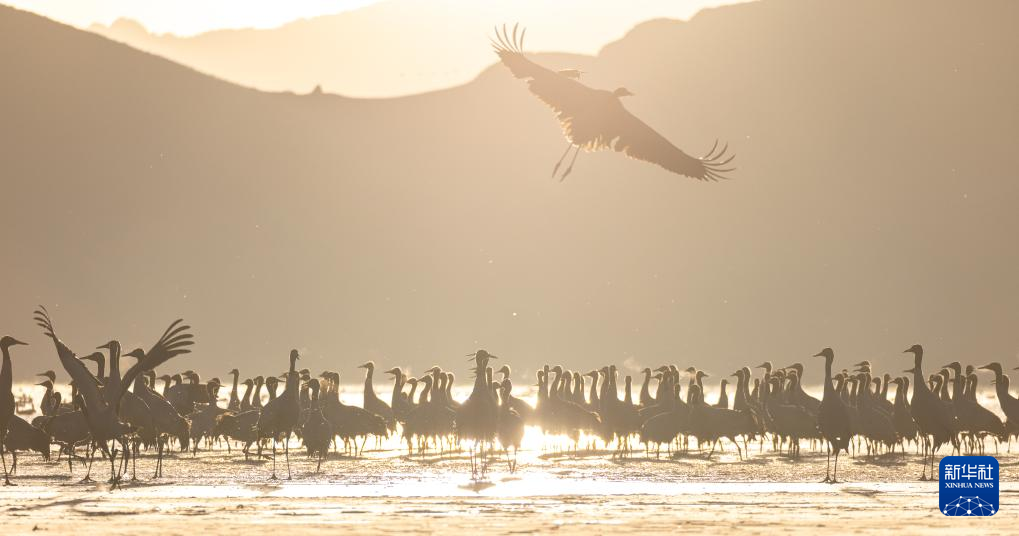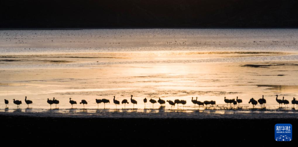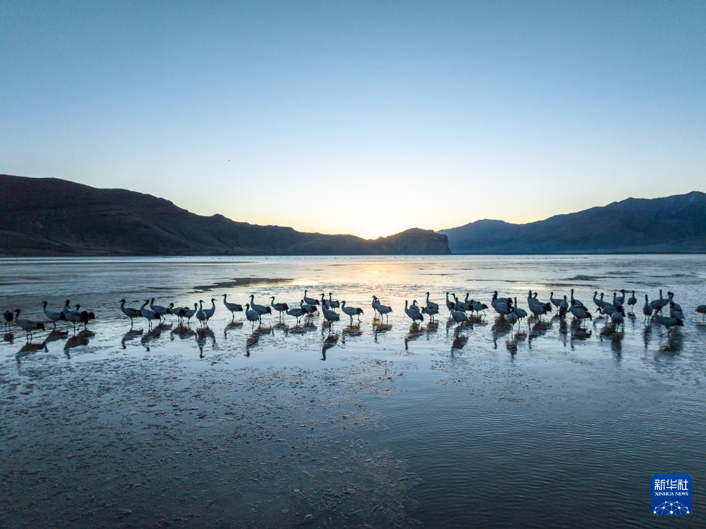 拉薩北部的林周縣平均海拔約4200米,是黑頸鶴的主要越冬地之一。清晨的陽光灑在林周縣虎頭山水庫,水面波光粼粼,鶴影婀娜多姿。