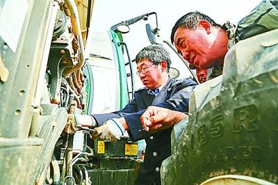 春季備耕時節(jié),山東省濱州市沾化區(qū)農(nóng)機部門組織“黨員農(nóng)機服務隊”到田間地頭為群眾服務。圖為3月27日,該區(qū)“黨員農(nóng)機服務隊”成員李成林(左一)在為群眾搶修拖拉機。賈海寧攝/光明圖片