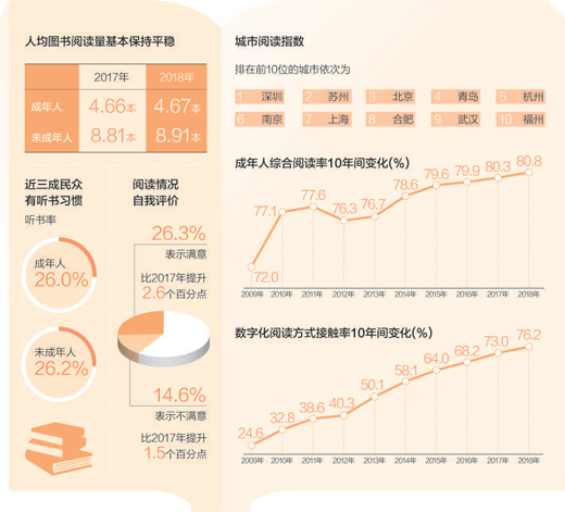 第十六次全國(guó)國(guó)民閱讀調(diào)查16日在京發(fā)布調(diào)查結(jié)果。數(shù)據(jù)顯示,2018年我國(guó)成年人人均紙質(zhì)圖書閱讀量為4.67本,成年人人均電子書閱讀量為3.32本。