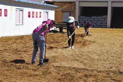 位于林芝市米林縣米林鎮(zhèn)雪卡村的米林鎮(zhèn)紅太陽科技示范家庭農(nóng)場,創(chuàng)建于2012年9月,38個溫室大棚里,有15個大棚用于種植靈芝。在尼瑪和米林縣米林鎮(zhèn)扶貧信息員程攀的帶領(lǐng)下,記者首先看到的是3個女工正在翻曬木屑,這是靈芝菌菌袋中最關(guān)鍵的“載體”——青崗木木屑?!扒鄬灸拘纪ㄟ^高溫蒸煮、殺毒殺菌等程序后再種下野外收集來的孢子粉,移到右邊的房間里培育?!背膛收f。