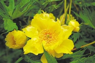 株高一兩米的大花黃牡丹掩映在一片片野生灌木叢中,一點點吸收陽光雨露再綻放出花朵。在片片綠葉的“呵護”下,大花黃牡丹有的嬌羞待放,有的則花瓣重重疊疊,在陽光下傲然吐露花蕊。