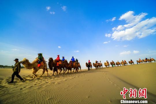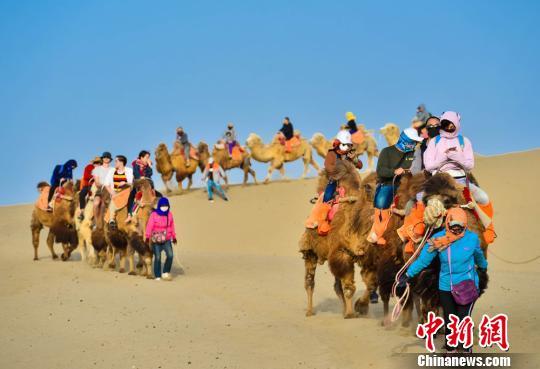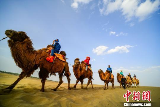 圖為大批游客騎駱駝體驗敦煌大漠風光。 王斌銀 攝