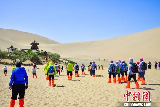 圖為5月1日,中外游客在鳴沙山月牙泉景區(qū)觀光游覽。 王斌銀 攝
