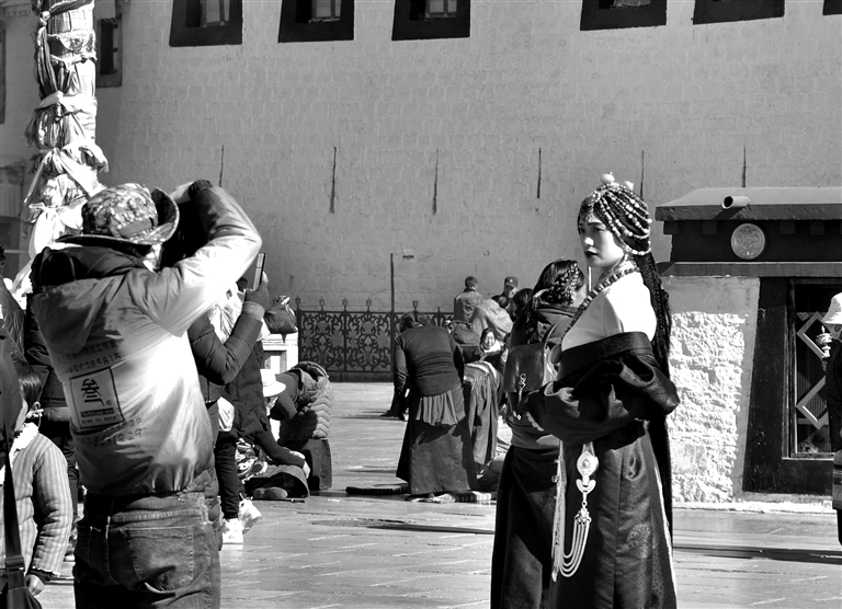 梳著彩辮,搖著轉(zhuǎn)經(jīng)筒,悠游名勝古跡,細(xì)細(xì)品味西藏氛圍,然后在八廓街古老的街道和庭院里拍一組西藏特色的藏裝照。隨著“冬游西藏”的熱度提升,來西藏游玩的游客也逐漸增多,在游玩的同時(shí)專門拍上一組濃郁地方特色的寫真也成為眾多游客的選擇,許多攝影工作室因此客源不斷。 圖為12月11日,游客在拉薩老城區(qū)身著藏裝拍照。記者 梁梅 攝