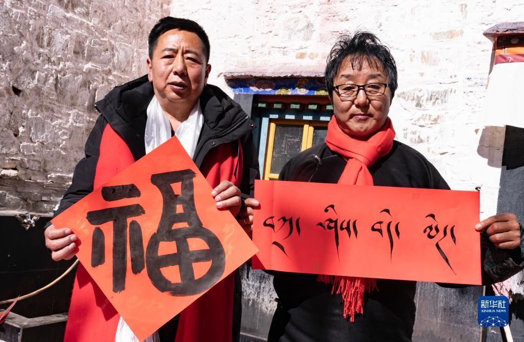 1月26日,書法家展示現(xiàn)場書寫的祝福字。新華社記者 普布扎西 攝