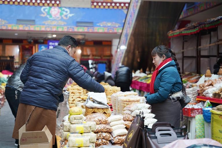 2月16日,記者來(lái)到拉薩市八廓商城與沖賽康市場(chǎng)。風(fēng)干肉、羅薩梅朵、卡賽、切瑪盒……攤位上各類年貨琳瑯滿目,一應(yīng)俱全,置辦年貨的人們?nèi)宄扇旱剡呑哌吿暨x自己中意的物品,準(zhǔn)備歡度藏歷新年。走進(jìn)八廓商城立馬便被里面熱鬧的場(chǎng)景所吸引,詢貨問(wèn)價(jià)的聲音不絕于耳。走到攤前,不等顧客開口,店家便會(huì)熱情地推銷起自己的貨物。