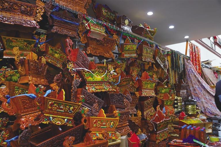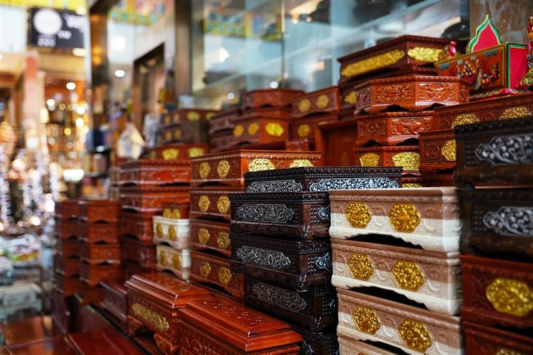 巴桑站在店門口展示著自家的切瑪盒,“我們家的切瑪盒做的可是一絕,而且不會(huì)因?yàn)榭爝^(guò)年了就胡亂加價(jià),50元至500元的都有,很多顧客都是從其他地方趕過(guò)來(lái)買。你看上面插的酥油花,這也是我父親做的,別看不大,每個(gè)都要兩三個(gè)小時(shí)才能做好?!卑蜕Uf(shuō)。