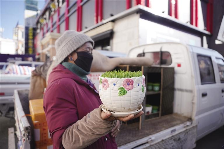 每年藏歷新年,家家戶戶都會(huì)在家里擺放青稞苗,寓意豐收吉祥。另一旁的攤位上記者看到,掛著水滴的青稞苗在溫暖的陽(yáng)光照射下,顯得格外好看。