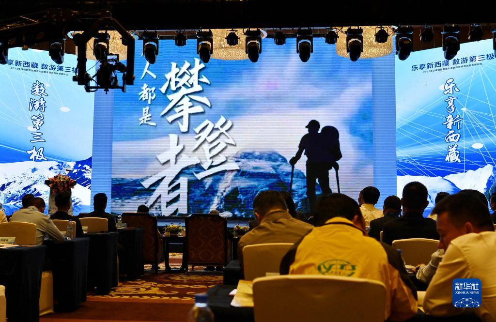 在2022年西藏日喀則旅游推介會(huì)暨數(shù)字旅游創(chuàng)新發(fā)展論壇上,播放“我想去珠峰”本地人采訪(fǎng)短片(7月15日攝)。新華社記者 張汝鋒 攝