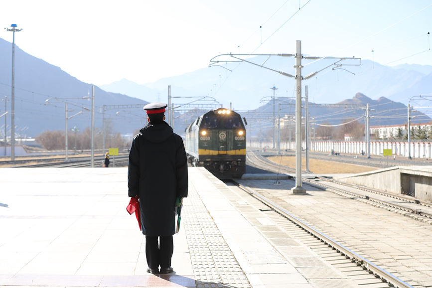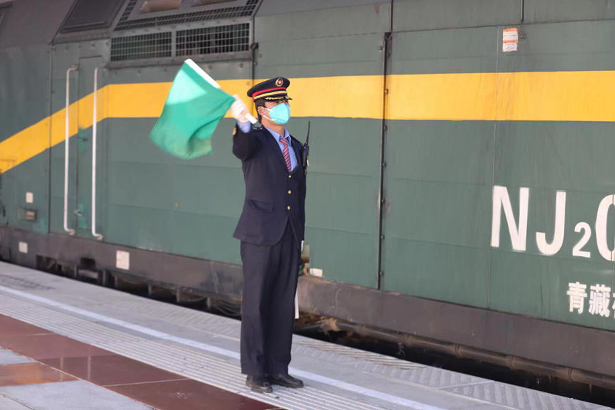 伴隨著一圈一圈揮動的信號旗,列車緩緩駛出拉薩站。目送著列車安全、準(zhǔn)時地駛離后,全海文收攏信號旗又大步向站臺另一端走去。