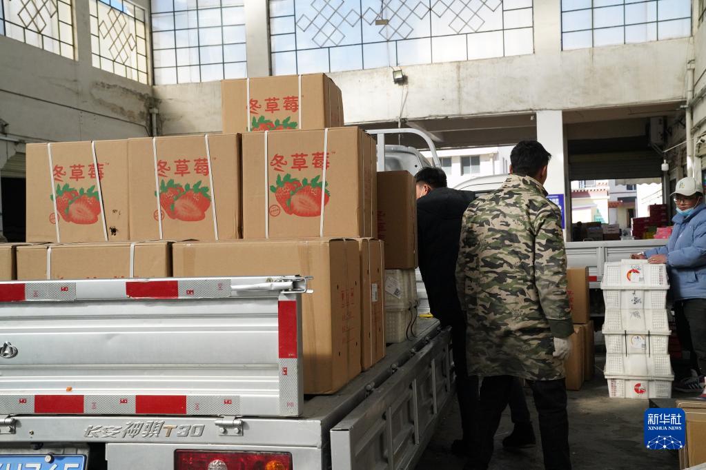東嘎批發(fā)市場里,員工們正將水果搬上車廂(1月28日攝)。新華社記者黃耀漫 攝