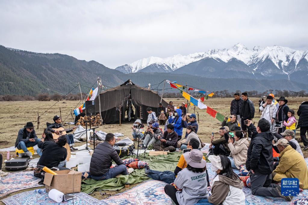 4月15日,在“巴松措漂流露營大會”現(xiàn)場,游客在觀看文藝表演。新華社記者 曹檳 攝