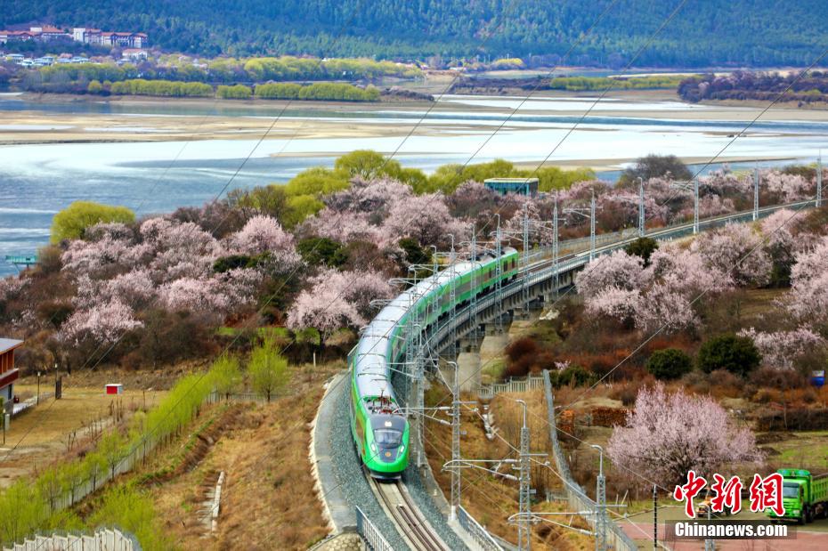 近日,中國鐵路青藏集團有限公司介紹,3月下旬至4月,拉林鐵路沿線綿延的野生桃花林盛開,藍天、白云、桃花、雪山、高原復興號動車等相互交織,形成了一幅幅美不勝收的畫面。圖為穿梭在桃花林中的拉林鐵路高原復興號。
