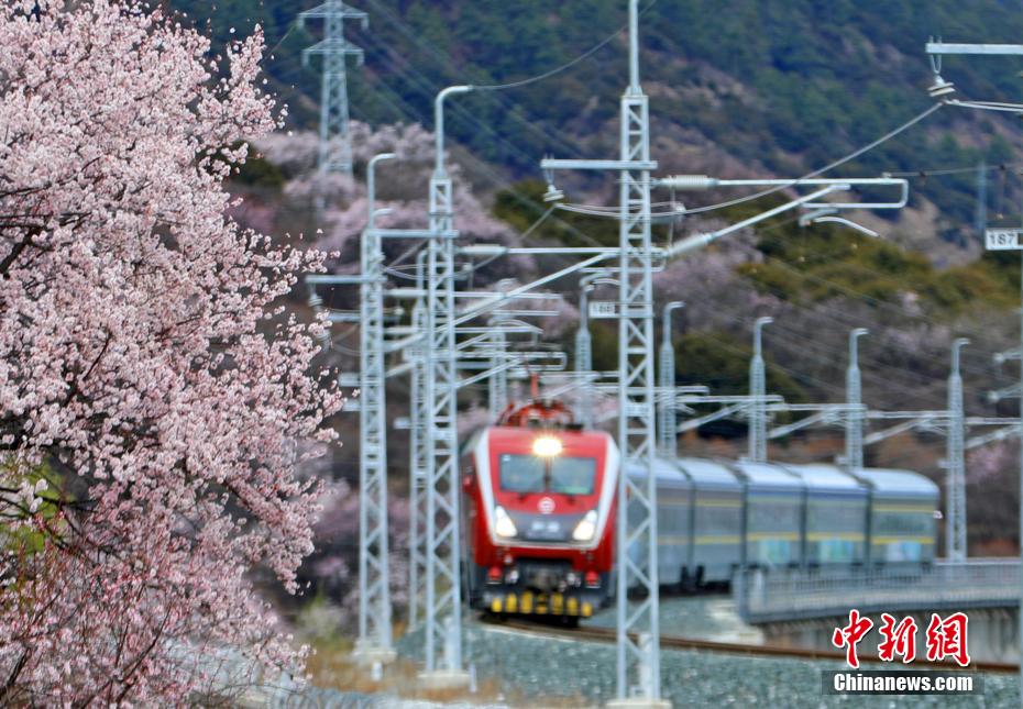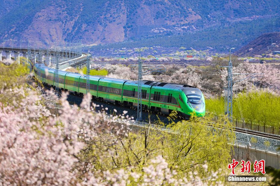 穿梭在桃花林中的拉林鐵路高原復興號。