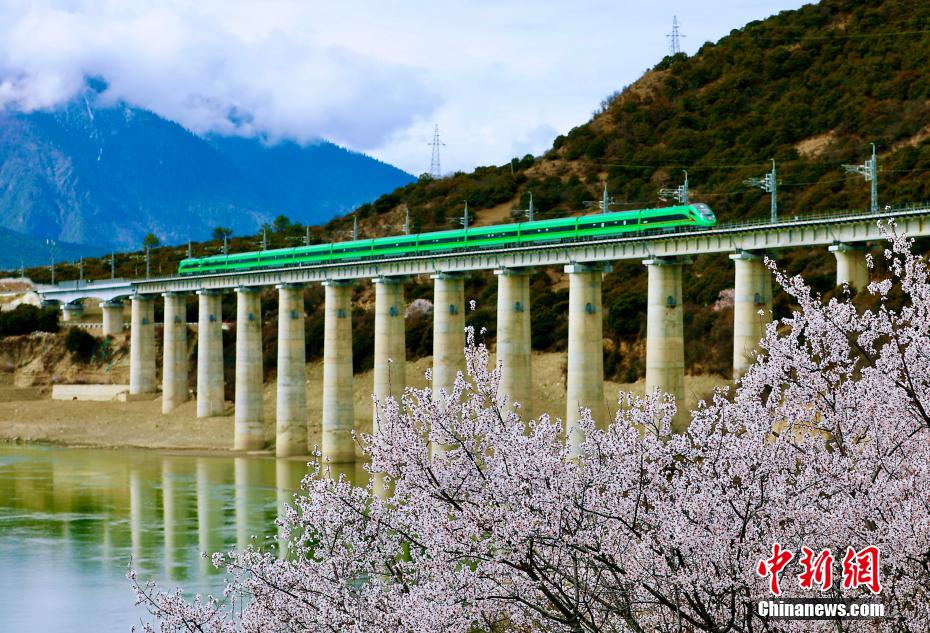 雪山、雅魯藏布江、高原復興號以及沿線的桃花。