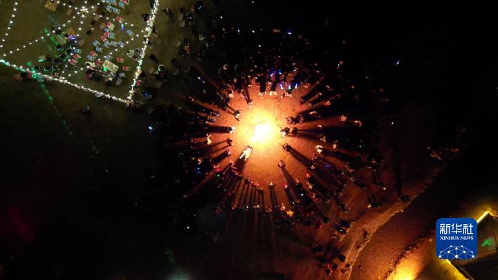 4月27日,游客們?cè)凇斑^(guò)林卡”現(xiàn)場(chǎng)跳起鍋莊舞,氣氛熱烈(無(wú)人機(jī)照片)。新華社記者聶毅 攝