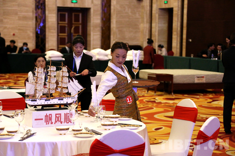 中國(guó)西藏網(wǎng)訊 5月11日,由西藏自治區(qū)旅游發(fā)展廳、西藏自治區(qū)總工會(huì)、共青團(tuán)西藏自治區(qū)委員會(huì)、西藏自治區(qū)婦女聯(lián)合會(huì)主辦,西藏旅游飯店業(yè)協(xié)會(huì)承辦的2023年西藏自治區(qū)星級(jí)飯店從業(yè)人員服務(wù)技能競(jìng)賽在拉薩開賽。45名選手圍繞中餐宴會(huì)擺臺(tái)、西餐宴會(huì)擺臺(tái)、中式鋪床及夜床服務(wù)、前廳服務(wù)4個(gè)項(xiàng)目同臺(tái)競(jìng)技?! ?/p>