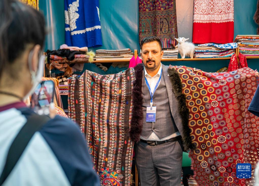 6月17日,來(lái)自印度的參展商在第五屆藏博會(huì)現(xiàn)場(chǎng)向顧客展示披肩。新華社記者 孫非 攝