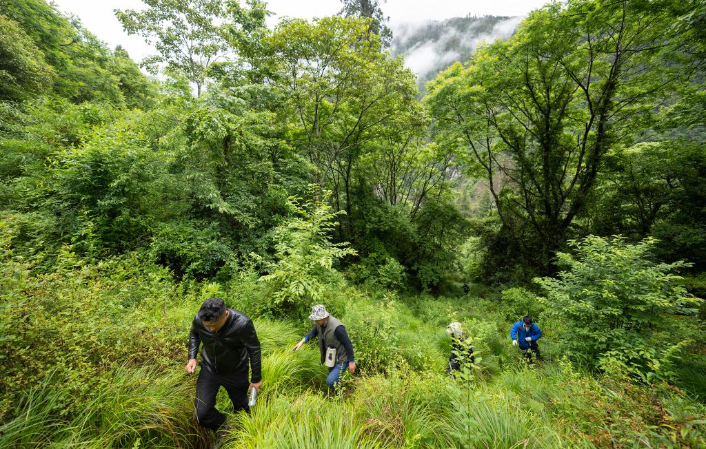 6月15日,波密縣林草局工作人員西繞(左)帶領(lǐng)大家穿過原始森林尋找亞洲第一高樹。