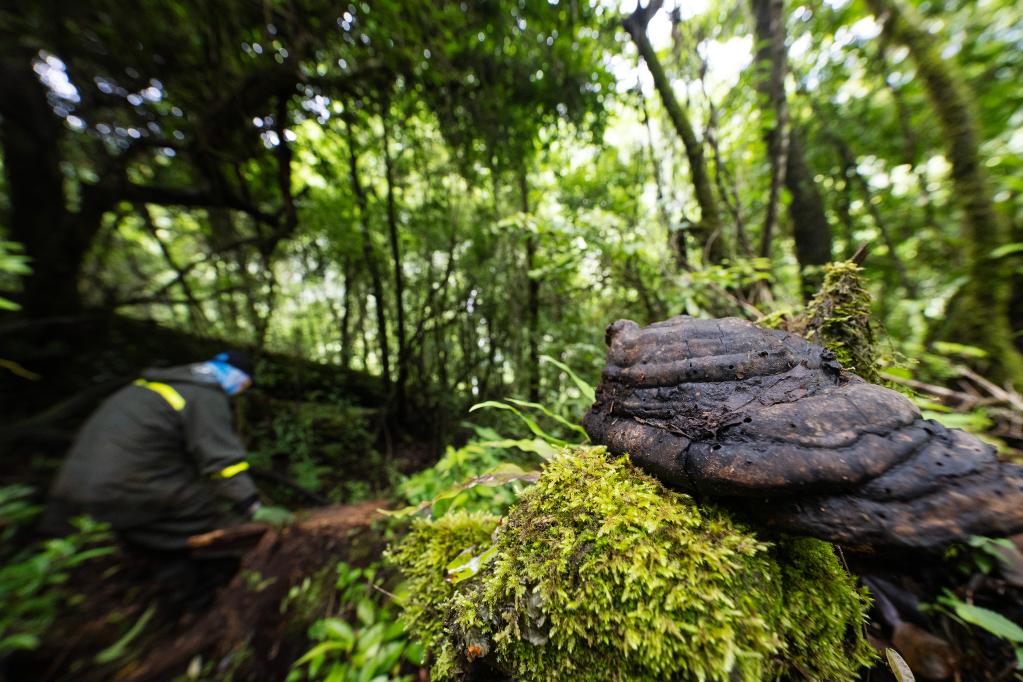 豈料吃完野樹莓幾分鐘之后,我們就進(jìn)入了巨樹的領(lǐng)地:聳入云霄的巨樹以及在其身下肆意生長的藤蔓、灌木、野草把我們團(tuán)團(tuán)圍住,不時還有倒塌的巨木攔住去路。沿著一條被踩出來的林中小徑,我們深一腳淺一腳地往前挪動,各種菌類以及叫不出名字的花花草草在林中隨處可見,在小徑旁邊,記者甚至見到了一個比巴掌還大的靈芝——這密不透風(fēng)的森林中,藏著多少驚奇??!