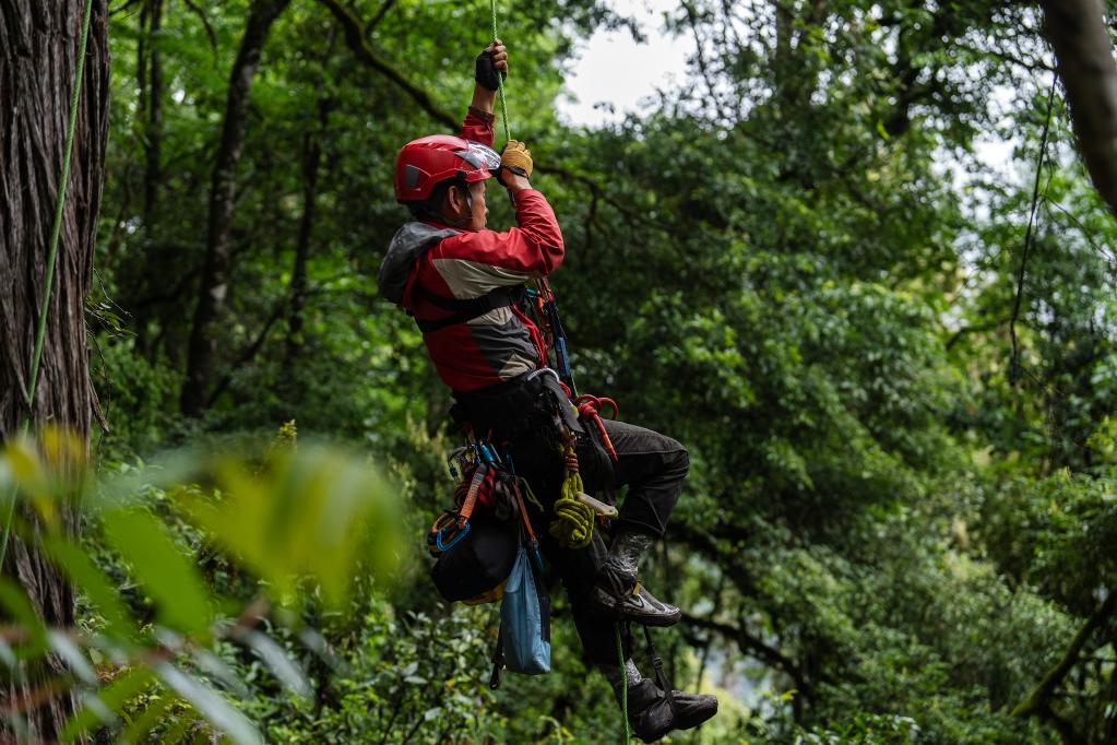 “我今天主要是兩項工作,第一個叫做攀樹的先鋒掛繩,就是把兩根攀樹的主繩掛到90米左右的一個高點;第二件事情是在我的攀登以及下降的過程中,給鐘老師、王孜博士,每隔5米,采集少量的葉片和附生植物,他們會拿回實驗室做一些分析對比。”