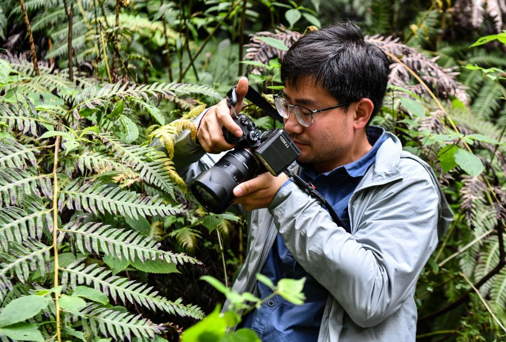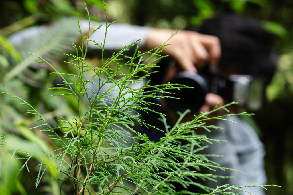 6月15日,中國科學(xué)院植物研究所博士研究生王孜在亞洲第一高樹旁拍攝一株西藏柏木的小樹苗。