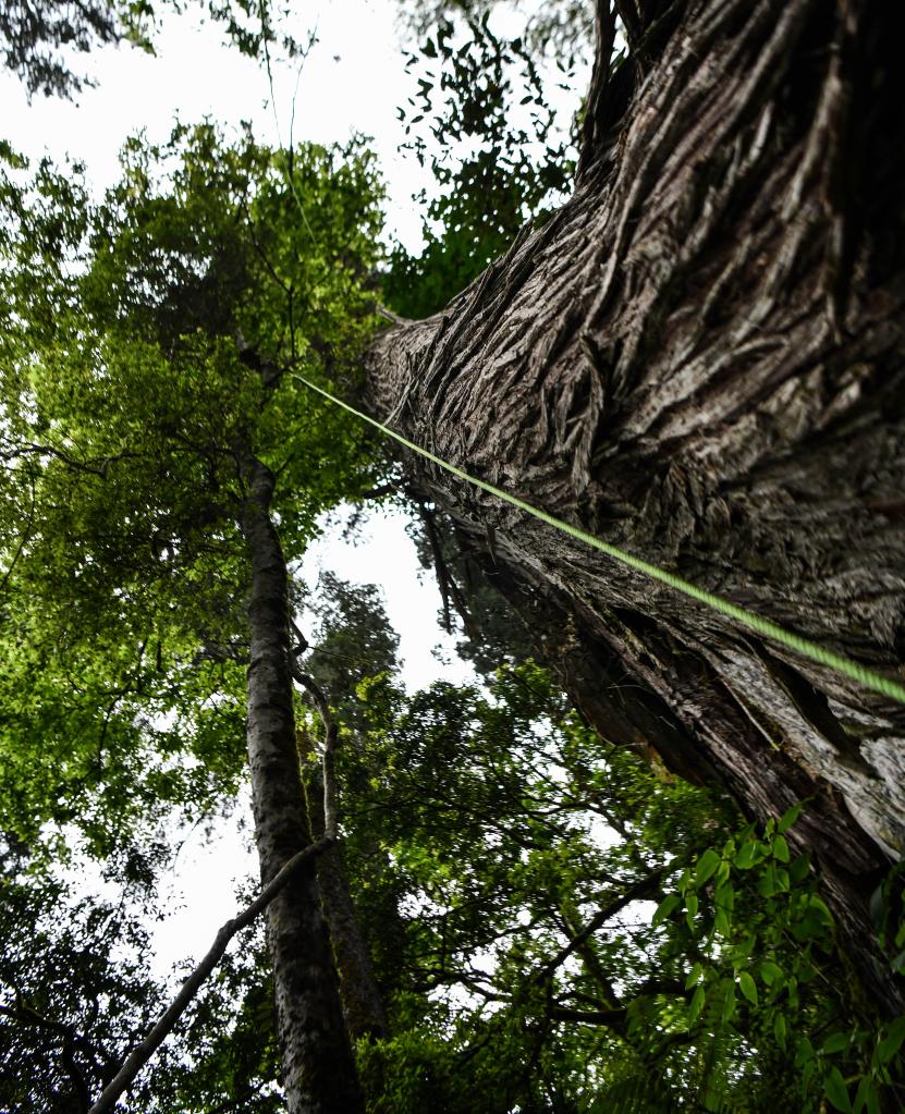 “到了,到了!”在森林中跌跌撞撞行進(jìn)了大概1個半小時后,在前面帶路的西繞一聲大喊,記者也緊走幾步,轉(zhuǎn)過一個小彎,前方樹木枝葉空隙處突然出現(xiàn)一根巨大的樹干,目測5、6個人都難以合抱,仰頭望去,在大樹距離地面約30米處伸出很多枝干,加上旁邊的樹葉遮掩,望不到頂。此時,一個如猿猴般矯捷的身影正順著巨樹上垂下的一根繩索向上攀爬。這是攀樹專家劉團(tuán)璽,此前在察隅縣發(fā)現(xiàn)的83.2米的云南黃果冷杉就是他和攀樹團(tuán)隊的伙伴們協(xié)助科學(xué)家進(jìn)行測量和生物考察的。