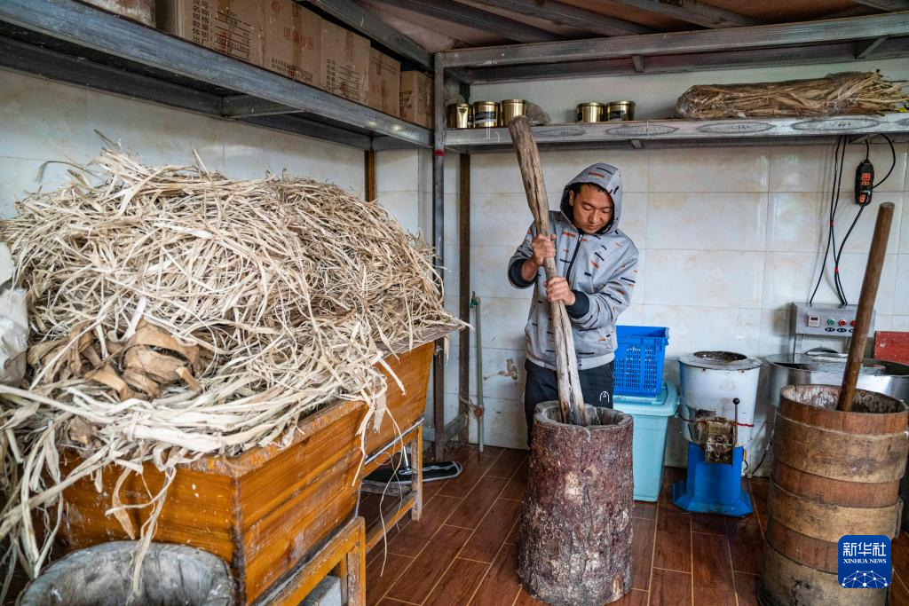 在西藏米林市羌納鄉(xiāng)西嘎門巴村,南迦巴瓦童螺嘎布工藝品農(nóng)民專業(yè)合作社的工作人員正在制作藏紙(7月26日攝)。新華社記者 孫非 攝  ??