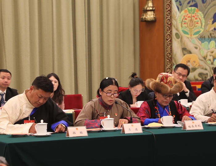圖為其德在十四屆全國(guó)人大二次會(huì)議西藏代表團(tuán)開(kāi)放團(tuán)組會(huì)議上發(fā)言攝影:桑吉