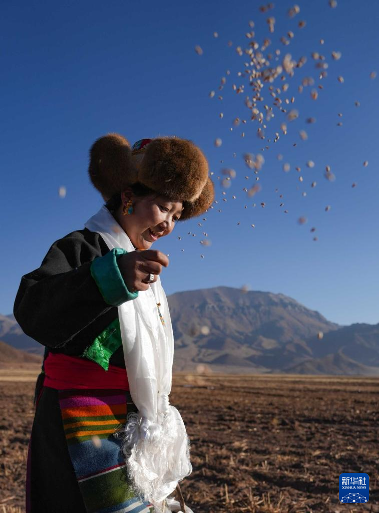 3月16日,在西藏拉薩市林周縣春堆鄉(xiāng)春耕儀式現(xiàn)場(chǎng),農(nóng)民播撒種子。新華社記者 晉美多吉 攝