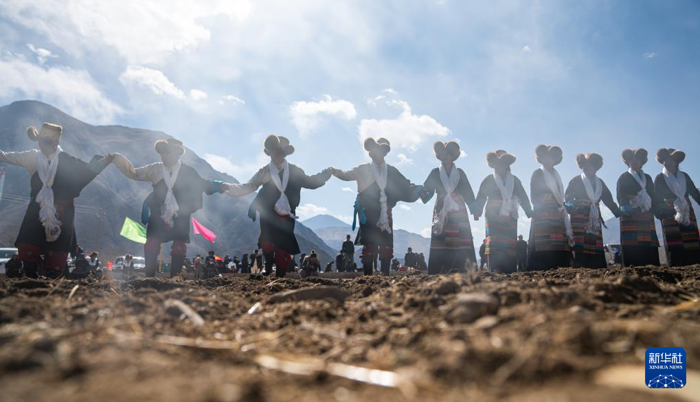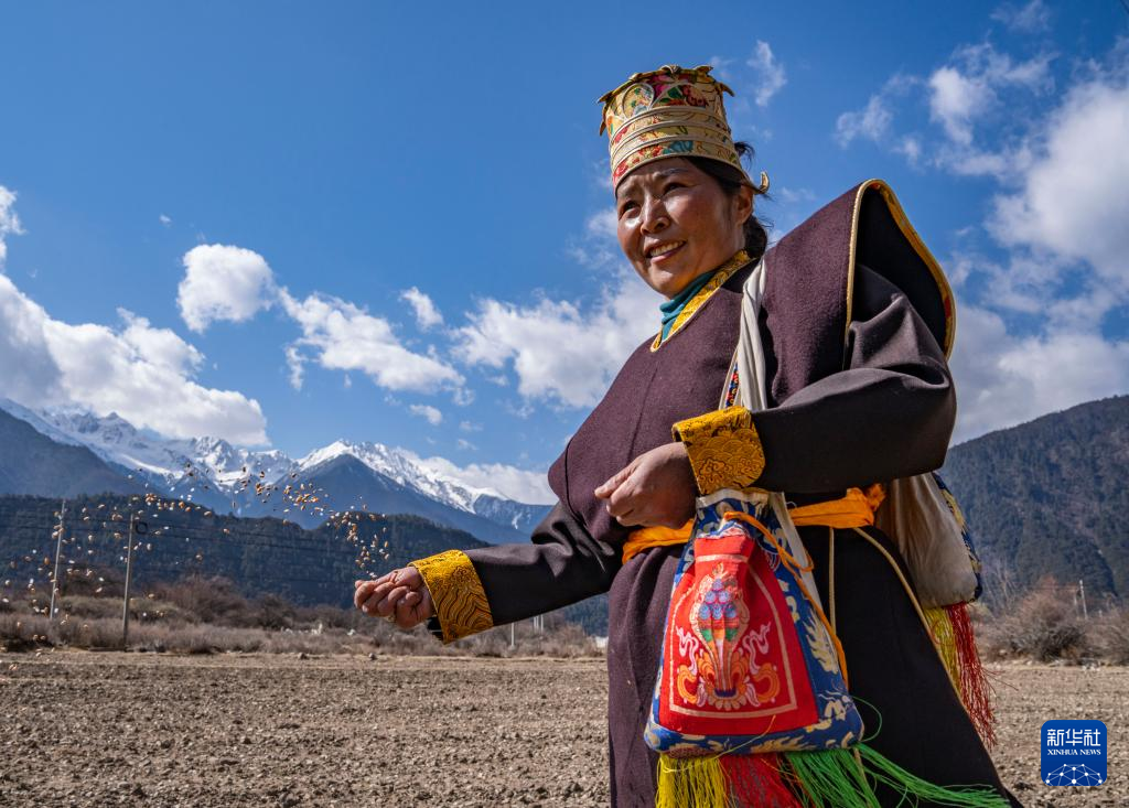 3月16日,在西藏拉薩市林周縣春堆鄉(xiāng)的春耕儀式現(xiàn)場(chǎng),當(dāng)?shù)厝罕姳硌莶貞?。新華社記者 張汝鋒 攝 ??