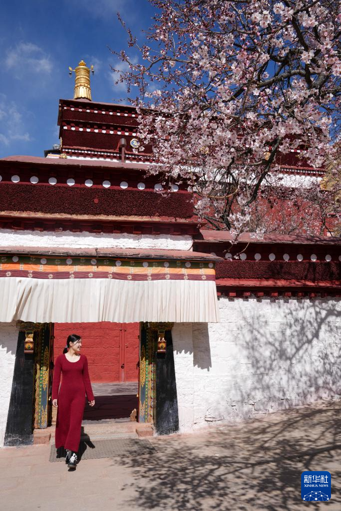 拉薩古剎帕崩崗周圍的桃花盛開,游客駐足留影(4月5日攝)。新華社記者 旦增尼瑪曲珠 攝