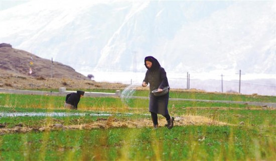 圖為唐加鄉(xiāng)卓村2組村民給自家冬小麥?zhǔn)┓?。記?格桑倫珠 通訊員 益西曲珍 嘎色 攝