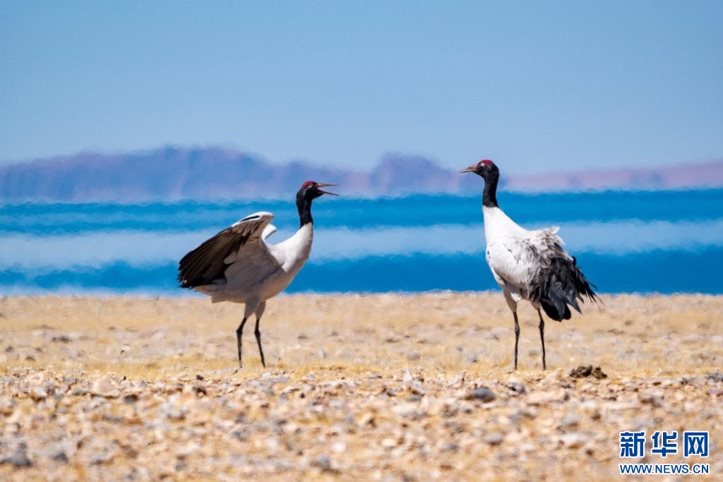 4月14日,在色林錯國家級自然保護區(qū)拍攝的黑頸鶴。新華網 旦增努布 攝