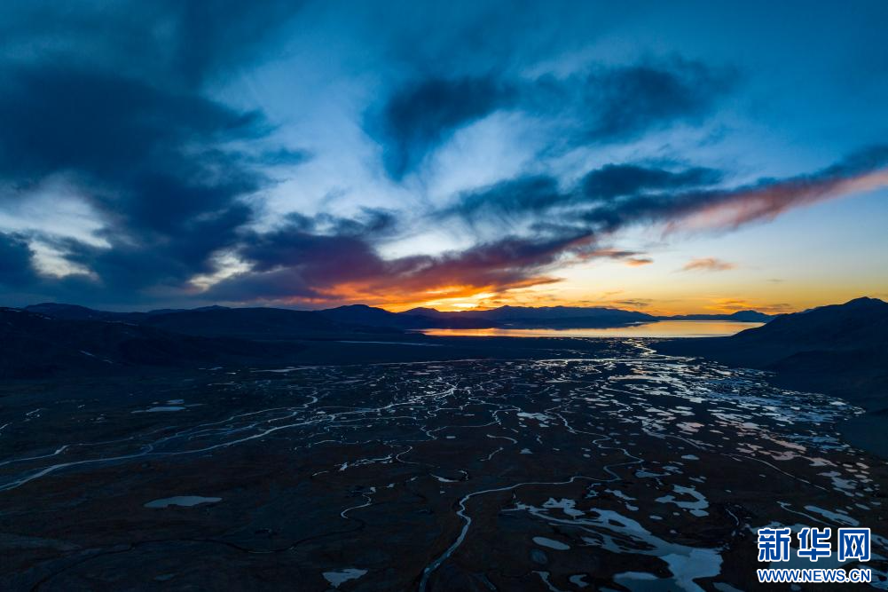 4月14日,傍晚從申扎縣縣城拍攝的色林錯景致(無人機照片)。新華網 旦增努布 攝