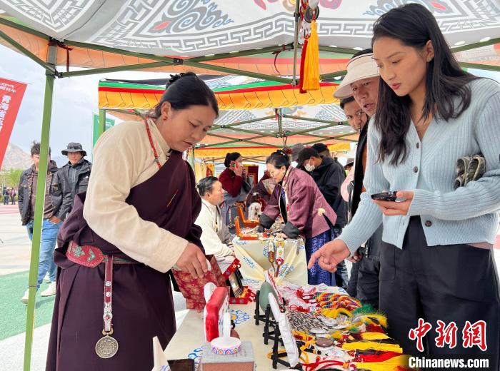 圖為才仁看卓(左)正在向游客介紹產(chǎn)品。李江寧 攝