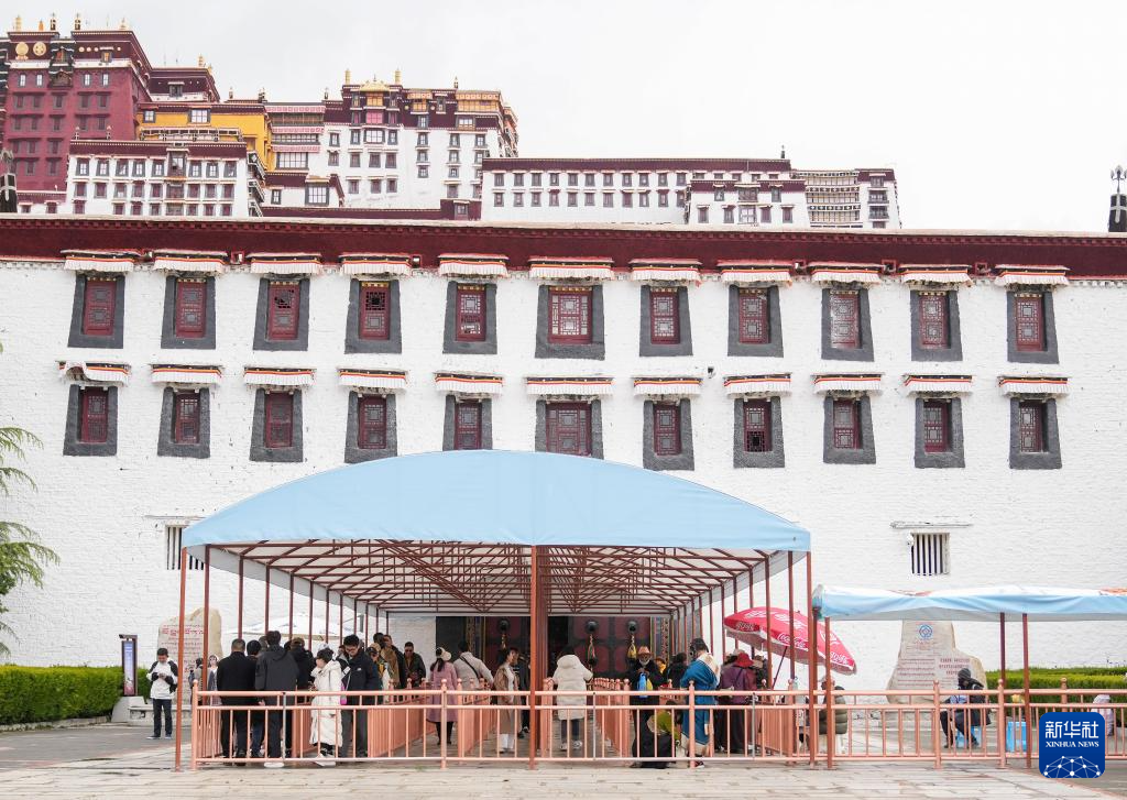 5月5日,游客在布達拉宮景區(qū)入口排隊等候參觀。新華社記者 丁汀 攝