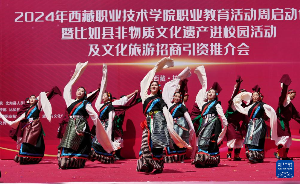 當日,西藏職業(yè)技術(shù)學院職業(yè)教育活動周在拉薩啟動,那曲市比如縣民族藝術(shù)團非物質(zhì)文化遺產(chǎn)表演暨“鄉(xiāng)村振興 那曲奮進”旅游推介走進校園,激發(fā)人們對傳統(tǒng)文化和特色旅游的興趣?! ??