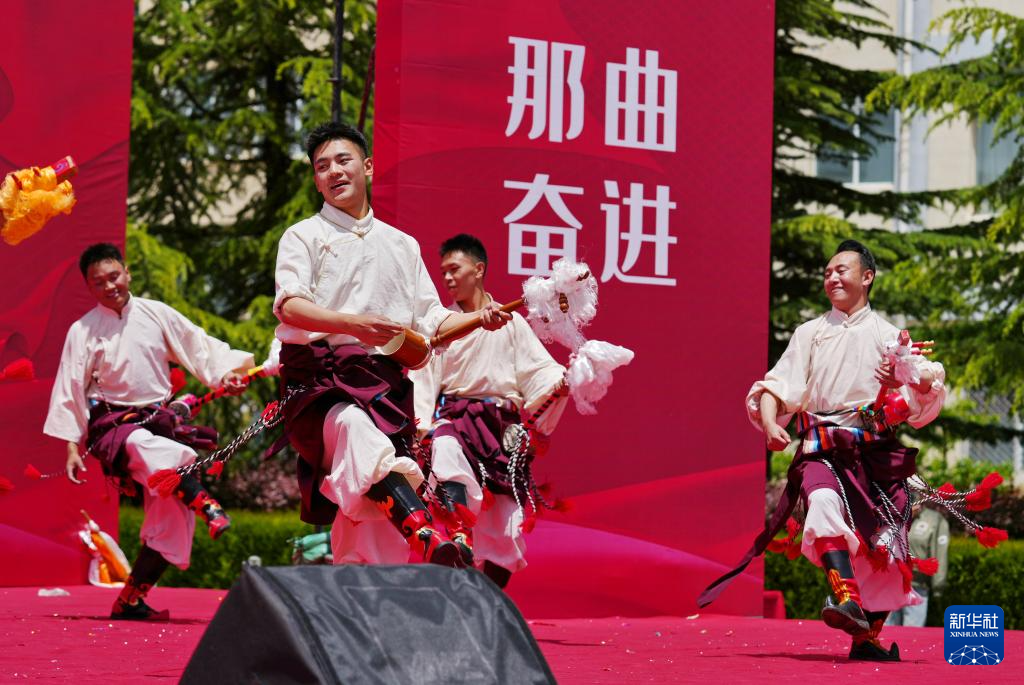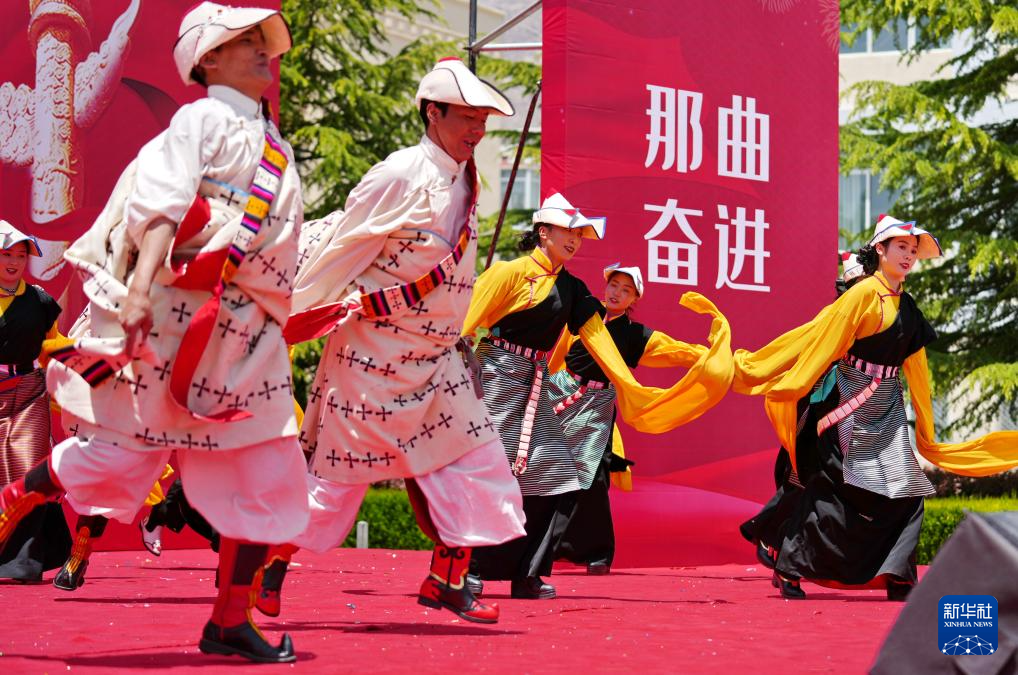 5月12日,在西藏職業(yè)技術(shù)學院職業(yè)教育活動周啟動儀式暨比如縣非物質(zhì)文化遺產(chǎn)進校園活動上,比如縣民族藝術(shù)團的演職人員在表演節(jié)目。新華社發(fā)(趙大志攝) ??