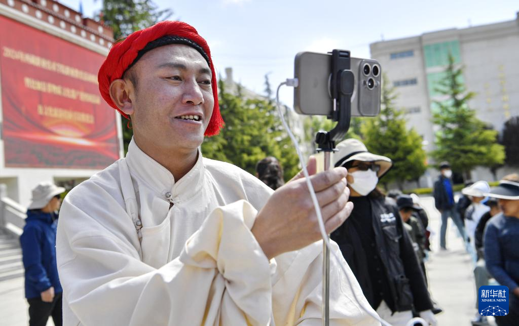 ?5月12日,在西藏職業(yè)技術(shù)學院職業(yè)教育活動周啟動儀式暨比如縣非物質(zhì)文化遺產(chǎn)進校園活動上,來自比如縣的一名旅游推介者在做現(xiàn)場直播。新華社記者 張汝鋒 攝 ??