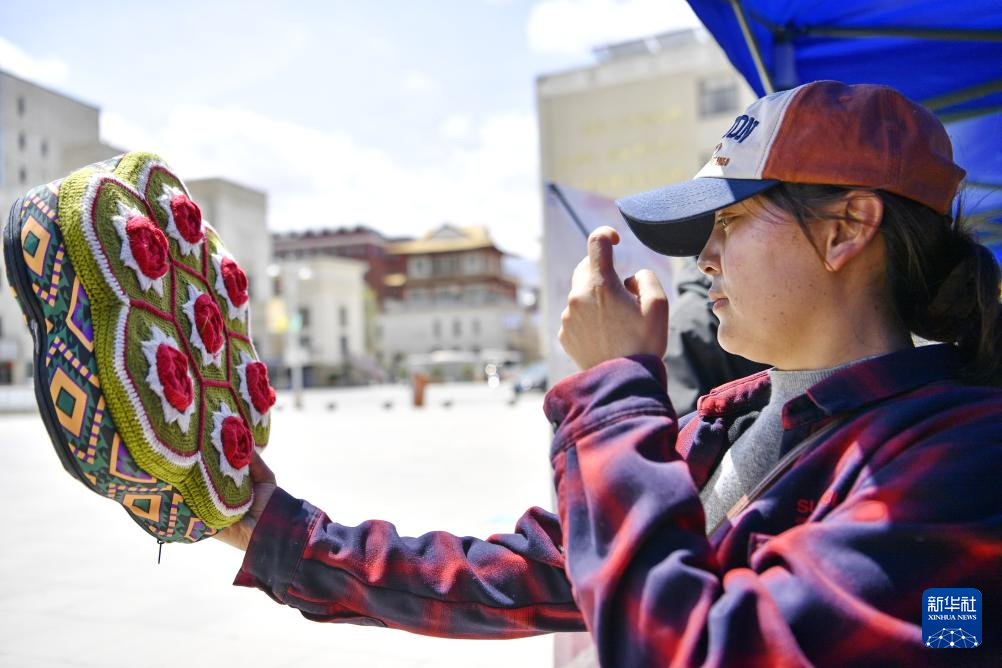 5月12日,在西藏職業(yè)技術(shù)學院職業(yè)教育活動周啟動儀式暨比如縣非物質(zhì)文化遺產(chǎn)進校園活動上,一名消費者在挑選比如縣的特色旅游產(chǎn)品。新華社記者 張汝鋒 攝