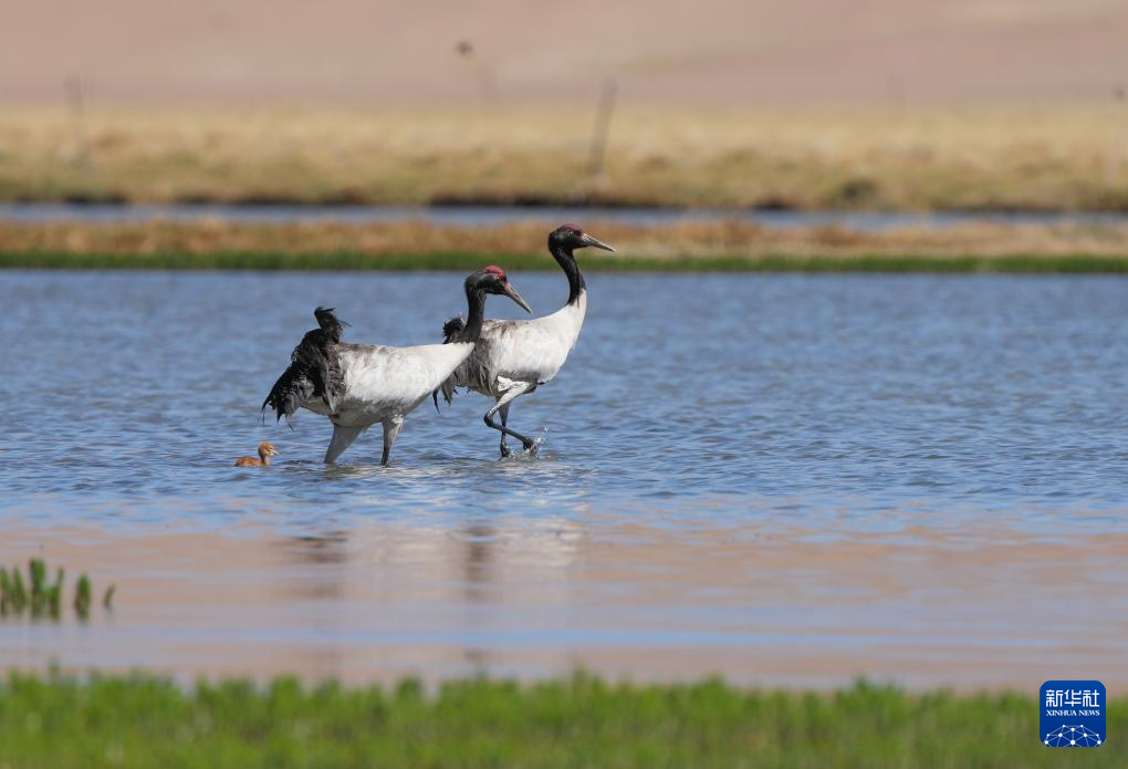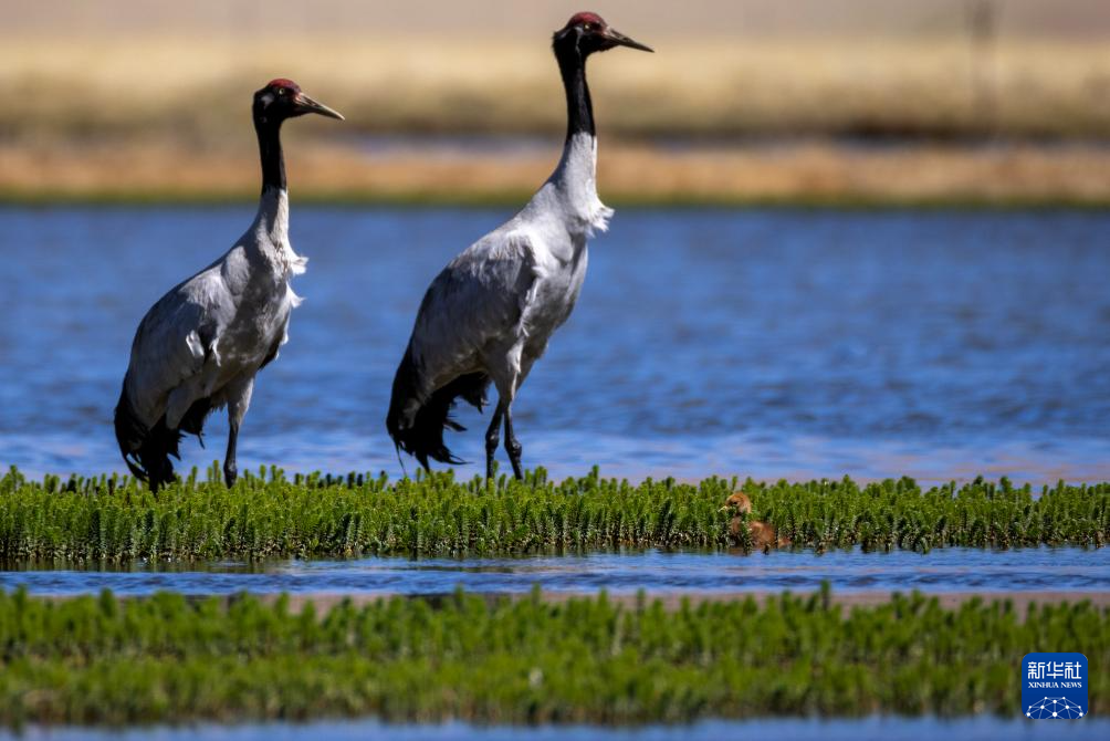 6月9日,黑頸鶴帶著雛鳥(niǎo)在西藏那曲市申扎縣一處濕地棲息、覓食。新華社記者 姜帆 攝