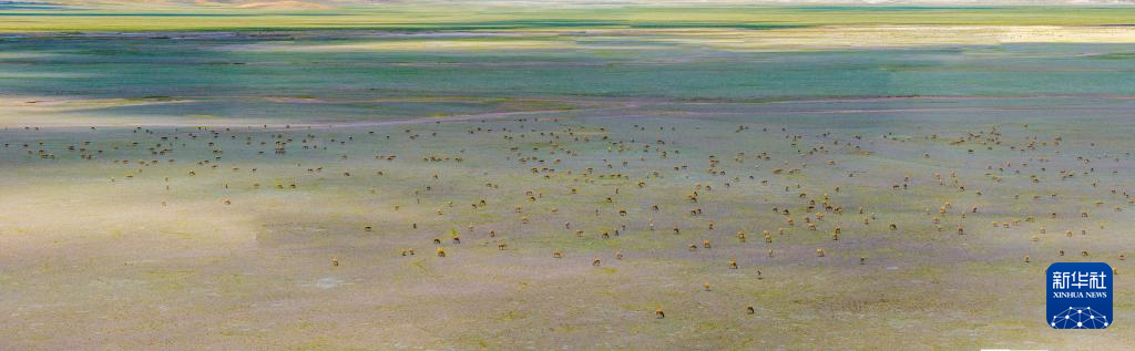 藏羚羊在魯確塘草原集結(jié)(無人機照片,6月8日攝)。新華社記者 姜帆 攝??