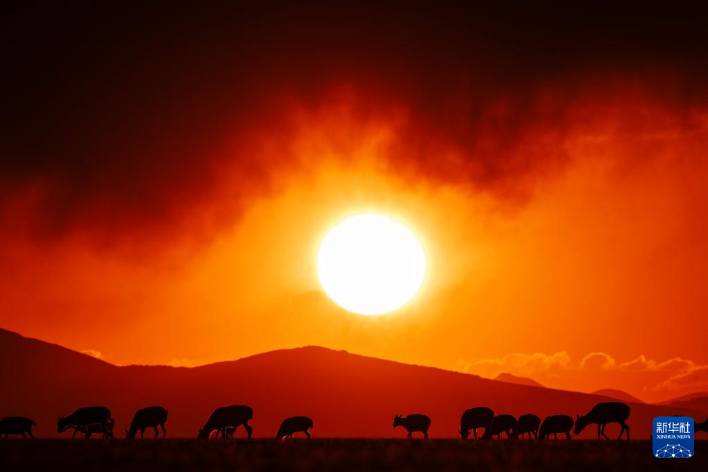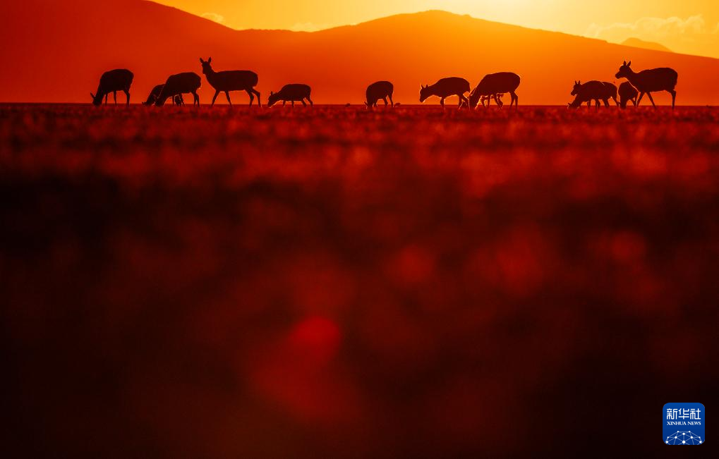 晚霞中魯確塘草原上待產(chǎn)的藏羚羊(6月16日攝)。新華社記者 費茂華 攝
