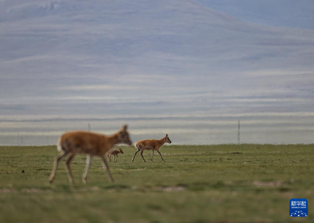 魯確塘草原上,藏羚羊護著剛出生的孩子(6月17日攝)。新華社記者 晉美多吉 攝