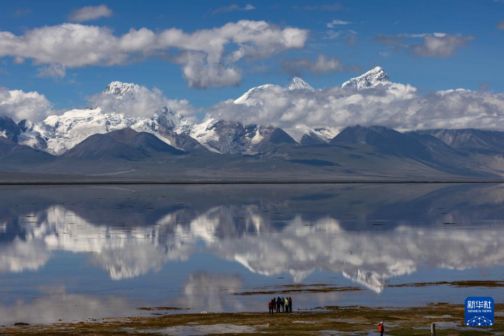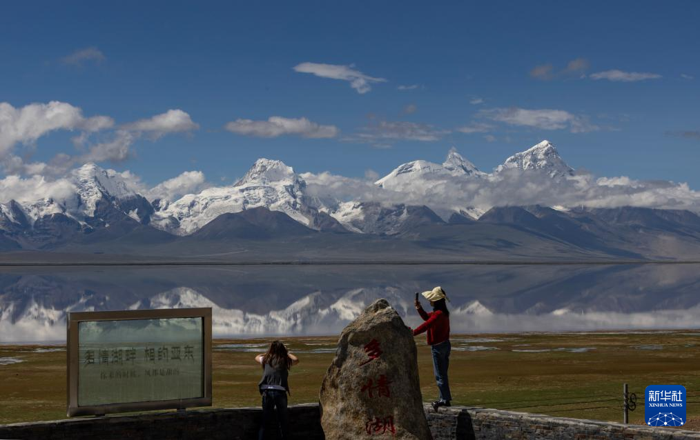 8月1日,游人在多慶錯(cuò)國(guó)家濕地公園拍攝卓木拉日雪山。新華社記者 姜帆 攝