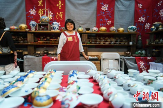 8月7日,拉薩進(jìn)口商品展覽會(huì)現(xiàn)場(chǎng),臺(tái)灣陶藝師白芃絪在自己的展位上。中新社記者 江飛波 攝