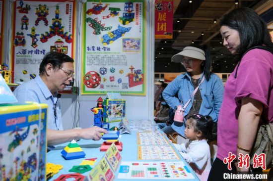 8月7日,臺(tái)灣博士?jī)簩?shí)業(yè)有限公司總經(jīng)理葉國義(左)在展覽現(xiàn)場(chǎng)演示益智教具。中新社記者 江飛波 攝
