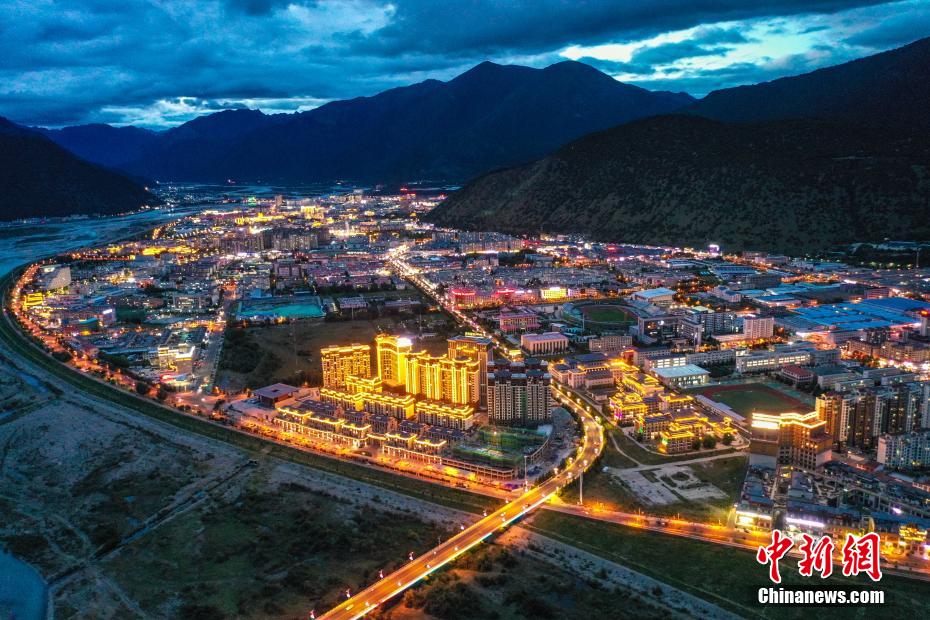 8月22日晚,西藏林芝市城市夜景美,城市建筑、橋體的燈光與尼洋河相映成趣,景色美麗。(無人機照片)中新社記者 貢嘎來松 攝