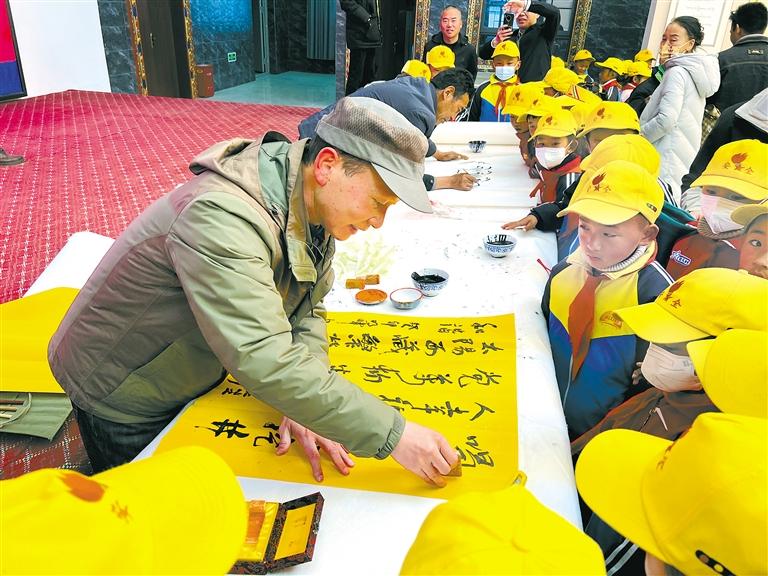 周明暉正在為學(xué)生示范書(shū)法創(chuàng)作。